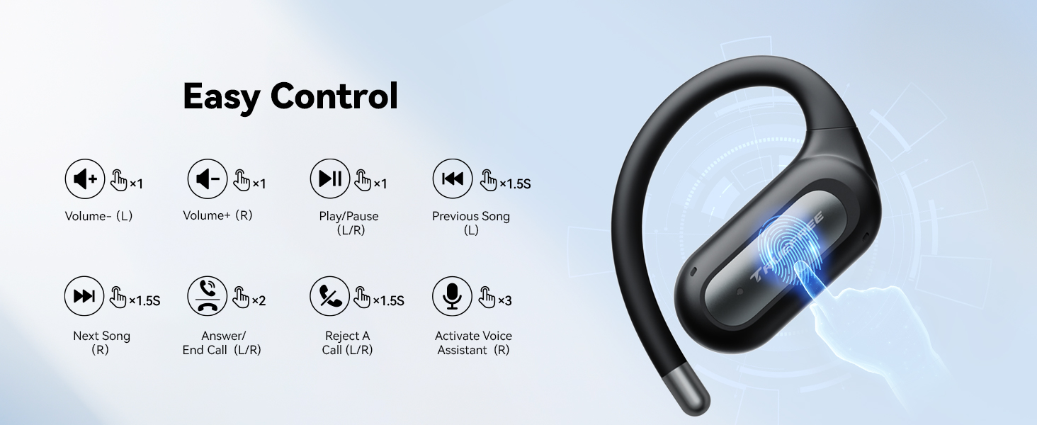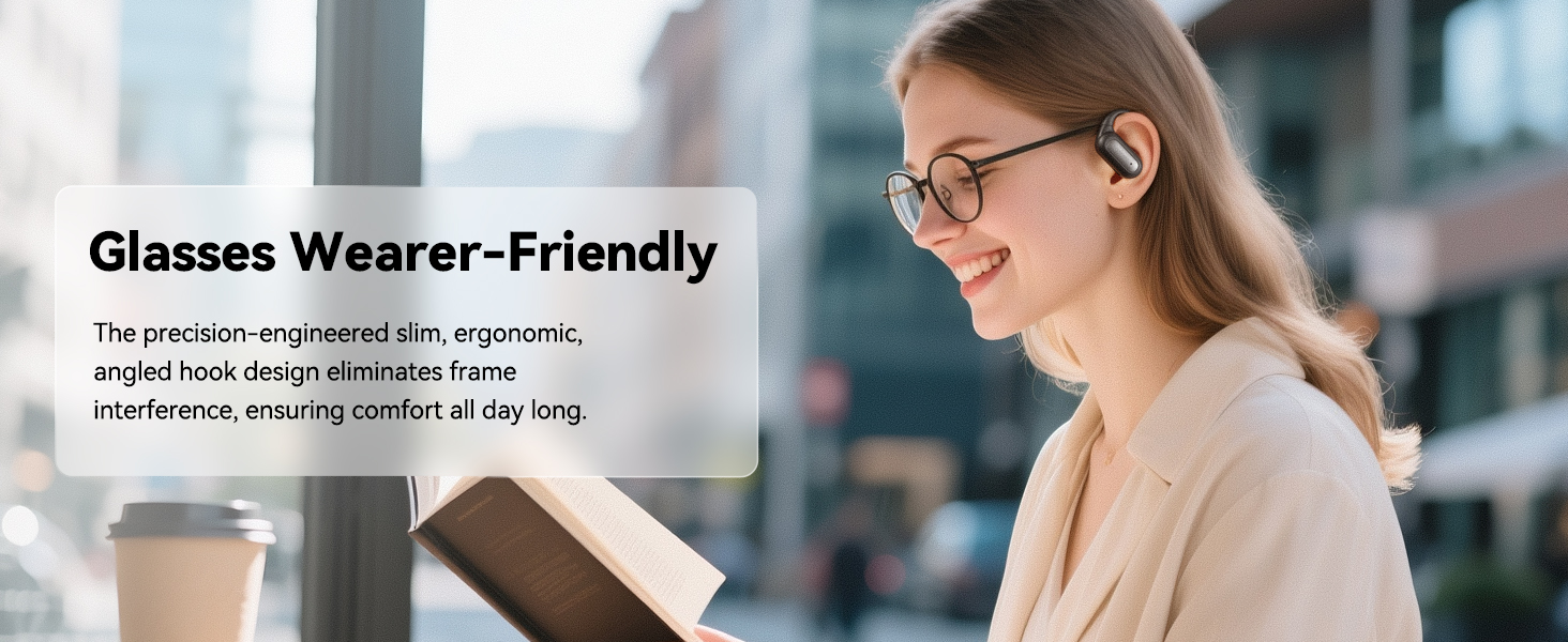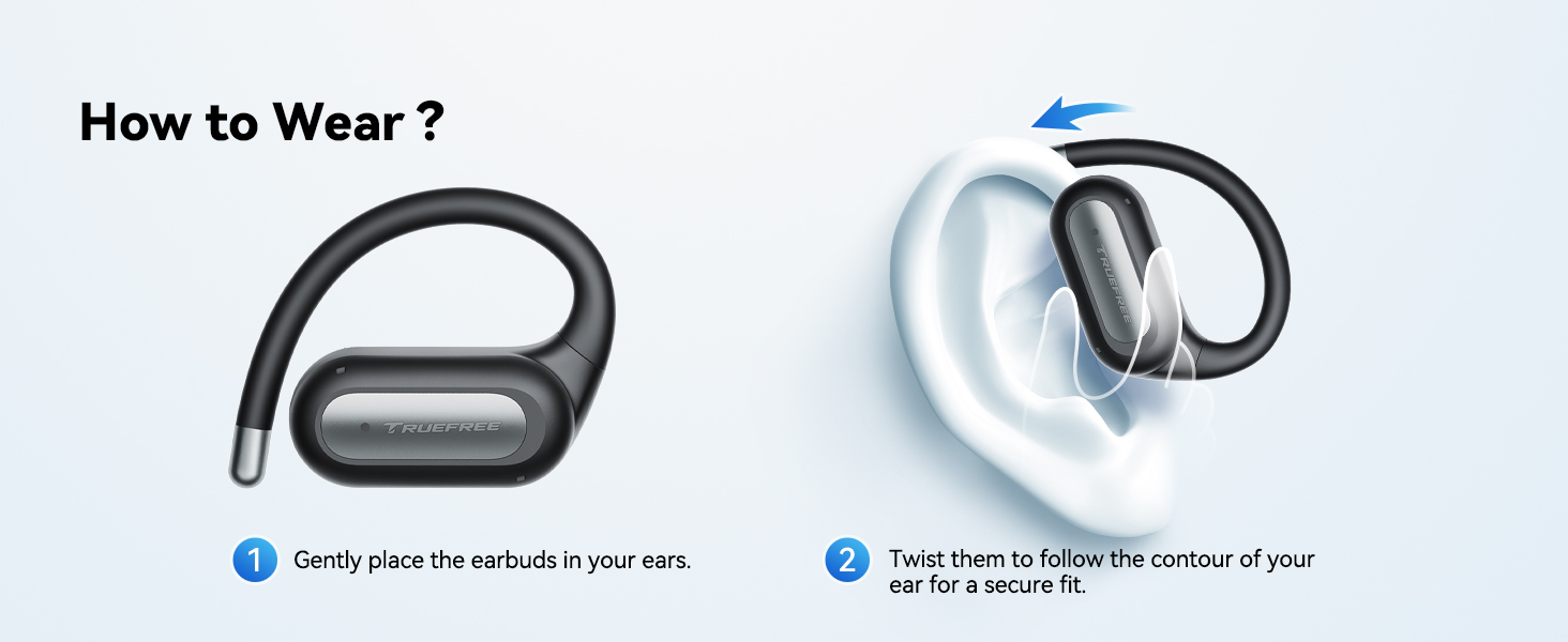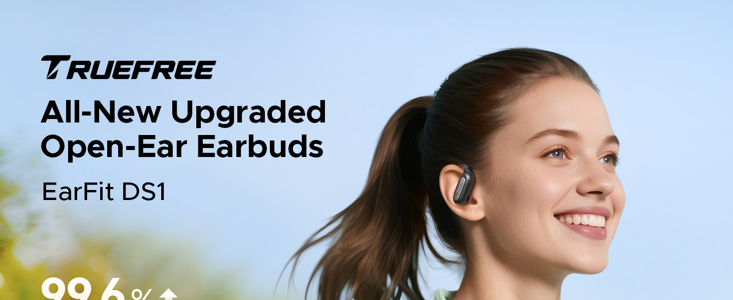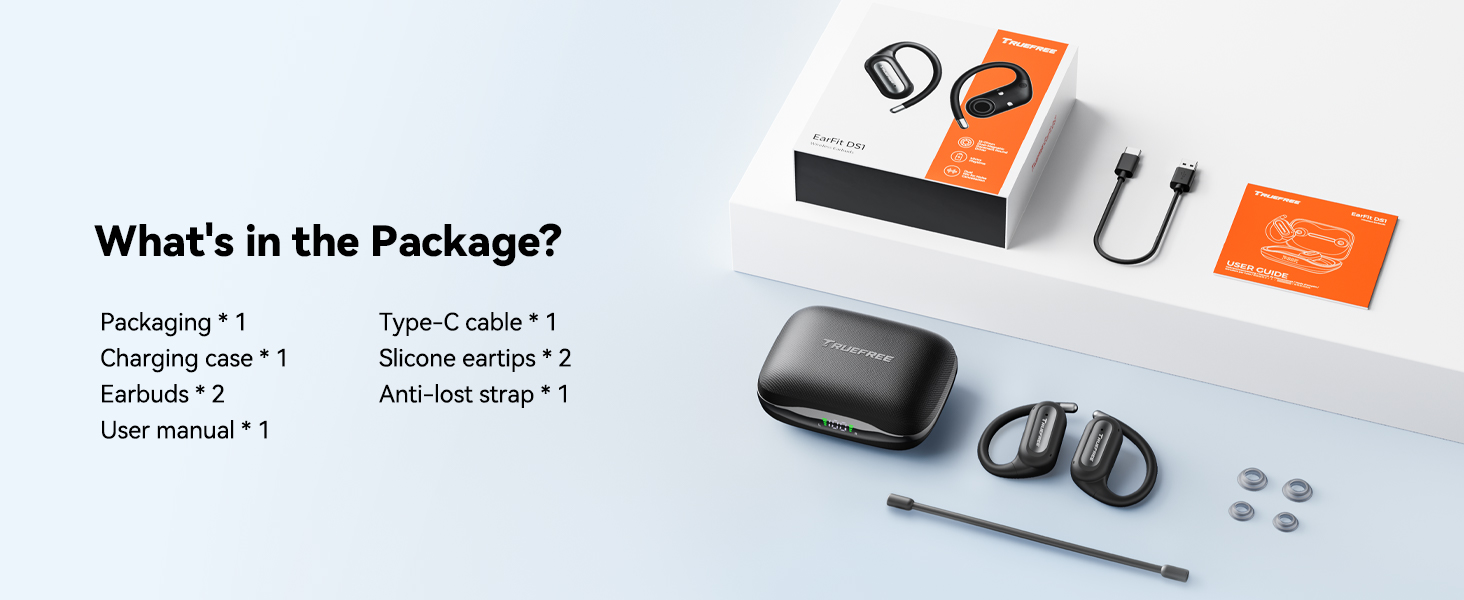 [Open-Ear Comfort for All-Day Wear] - Designed with a non-intrusive open-ear style, the Truefree DS1 headphones deliver breathable comfort without ear fatigue. Each earbud weighs just 8.9g and features ultra-flexible 0.6mm titanium memory wire hooks and a detachable neckband, comfortable even for glasses wearers.