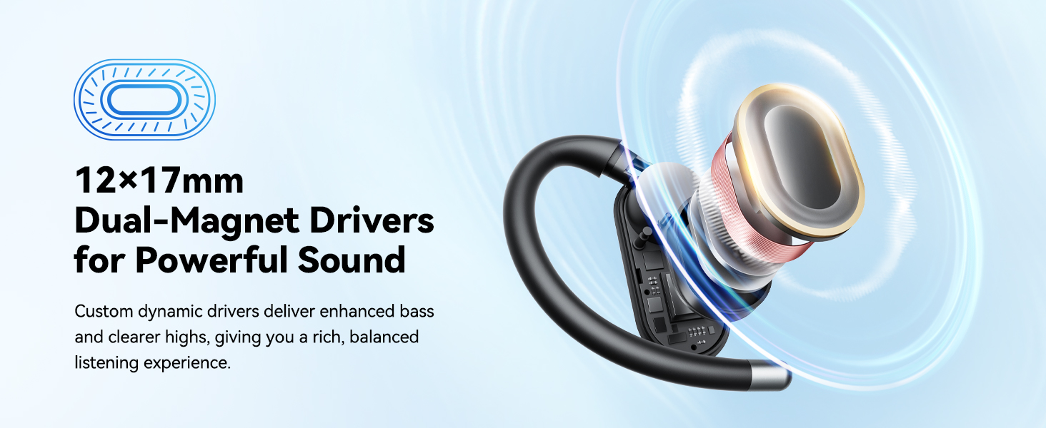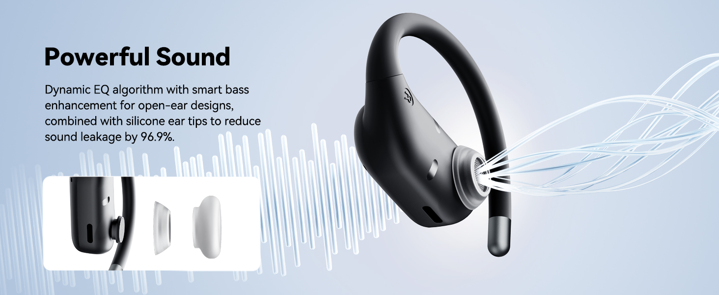[Immersive Spatial Audio with Deep Bass] - Powered by oversized 12 x 17mm dual-magnet drivers and dynamic EQ tuning, the DS1 wireless earbuds deliver rich bass and true 360° spatial audio. Interchangeable acoustic conduits reduce sound leakage by up to 98.9%, keeping your listening immersive and private.